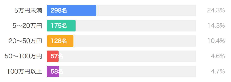続いて「5~20万円」が175名(14.3%)、「20~50万円」が128名(10.4%)、「100万円以上」が58名(4.7%)と続きます。