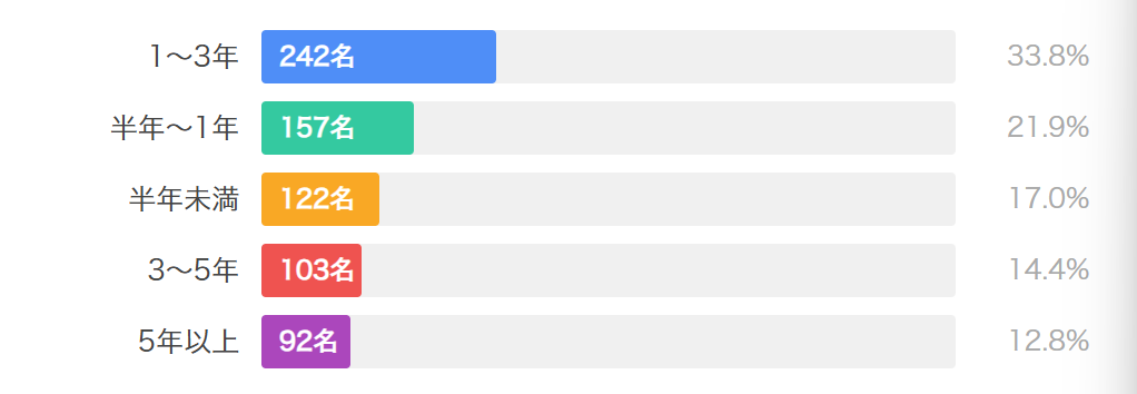 経験者の中では、比較的初心者層(1~3年)が最も多く、全体の約3分の1を占めています。