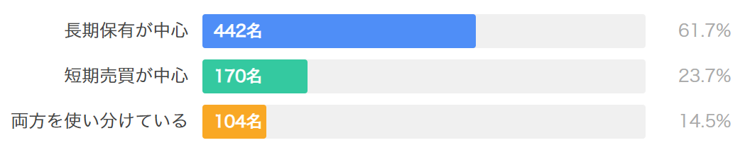 長期保有中心の戦略を採用する投資家が約61.7%と大多数を占めています。