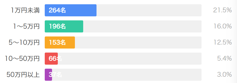 初回投資額を調べてみると、「1万円未満」が264名(21.5%)と最多で、「1~5万円」が196名(16.0%)と続きます。