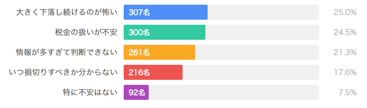 同程度の割合で税務処理の不安も存在しており、300名(24.5%)が挙げています。さらに情報過多による判断困難(261名・21.3%)やいつ損切りすべきか分からないという迷い(216名・17.6%)も顕著な課題として浮かび上がります。