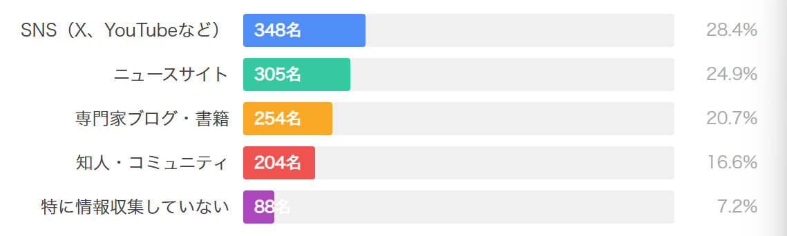 投資情報の収集先を聞いてみました。ソーシャルメディアが最も一般的な情報収集チャネルで、348名(28.4%)の投資家が活用しており、ニュースサイト(305名・24.9%)や専門家ブログ・書籍(254名・20.7%)と比較すると、リアルタイムで拡散されやすいSNS情報への依存が高い傾向がみられます。